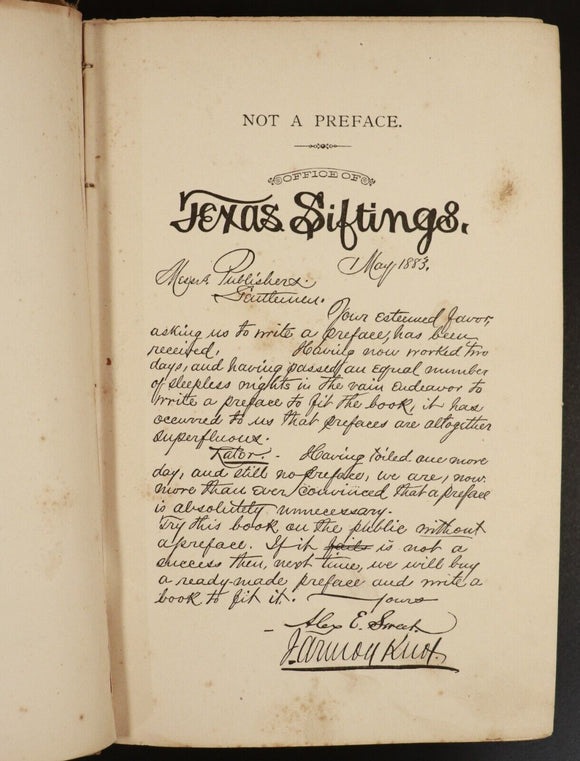 1883 On A Mexican Mustang by Alex E. Sweet Antique American Fiction Book 1st UKOn A Mexican Mustang - Through Texas, From The Gulf To The Rio GrandeBy Alex E. SweetPublished by Turner & Co: London 1883 1st UK Edition"Alexander Edwin Sweet (1841 - 1901), son of James R. and Charlotte (James) Sweet, was born in St. John's, New Brunswick, Canada, on March 28, 1841. He was the only wholly Texan humorist in the nineteenth century who achieved international recognition. His book Through Texas on a Mexican Mustang, first published serially in Siftings in 1882-83, was an immediate success, and in England it was being reprinted as late as 1905."Heavy wear and blemishes to cover and spine as shown. Binding is generally solid however page 1 is loose. A few age spots present with the vast majority of the book being clean. Please study photos to understand condition. Happy to provide more photos on request.Size 23cm x 16cm x 5.5cm - 672 Pages
