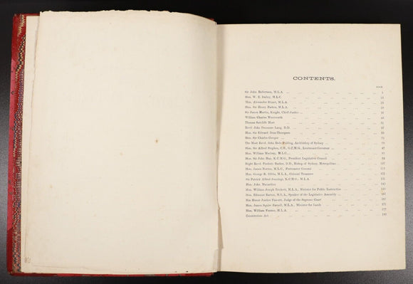 "This impressive 1st Edition book contains biographies of twenty-four prominent men in Australia's history. Each biography is written with great detail and is accompanied by a full page plate portrait. The book also contains two additional sections being The Constitution Act and The History of the Soudan Expedition: A historical record of the events relating to the levy, despatch and return of the New South Wales Contingent, raised for service in Egypt, March-June 1885. "