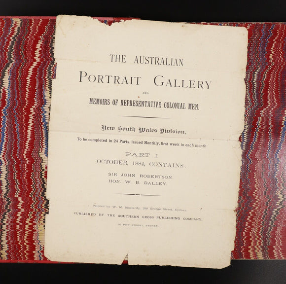 1885 The Australian Portrait Gallery Antiquarian Australian History Book The Australian Portrait Gallery & Memoirs Of Representative Colonial MenAppendices: Constitution Act & History Of The Soudan ExpeditionPublished by The Southern Cross Publishing Co: Sydney 1885 1st EditionEffectively 3 Volumes In 1"This impressive 1st Edition book contains biographies of twenty-four prominent men in Australia's history. Each biography is written with great detail and is accompanied by a full page plate portrait. The book also contains two additional sections being The Constitution Act and The History of the Soudan Expedition: A historical record of the events relating to the levy, despatch and return of the New South Wales Contingent, raised for service in Egypt, March-June 1885."General wear and fading to the covers and spine with some rub through and peeling to the leather as shown. All 24 plates are present. Outer hinges somewhat weakened however covers are holding strong and the books structural integrity is excellent. A heavy book showing its age but still holding strong. Spine has been conditioned to preserve and soften the leather. Inside hinges have split however binding is very good with no loose pages. Pages generally clean and bright with a few age marks and foxing to some plates. Good to very good condition overall. Please study photos to further understand condition.Size 28cm x 23cm x 3cm - 979 Pages