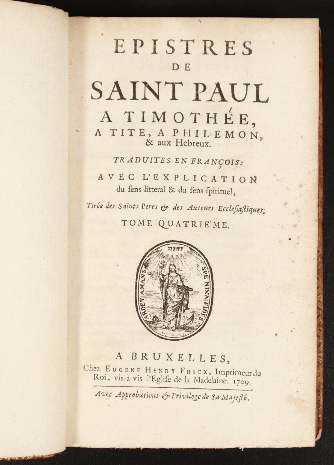 The subsequent volumes—Aux Galates, Ephésiens, Philippiens, Colossiens, Thessaloniciens (356 pages), and A Timothée, A Tite, A Philémon & Aux Hébreux (389 pages)—extend this exegesis to Paul's pastoral and doctrinal letters, addressing both personal counsel and theological universals such as grace, redemption, and perseverance in faith. Likely based on the Latin Vulgate and enriched with extensive marginal notes, the work reflects the Catholic humanist scholarship of the late 17th and early 18th centuries, combining linguistic precision with devotional insight. Taken together, these volumes stand as a comprehensive and elegantly printed example of early modern biblical commentary, illustrating how European theologians of the period sought to reconcile scriptural study with ecclesiastical tradition and classical erudition.