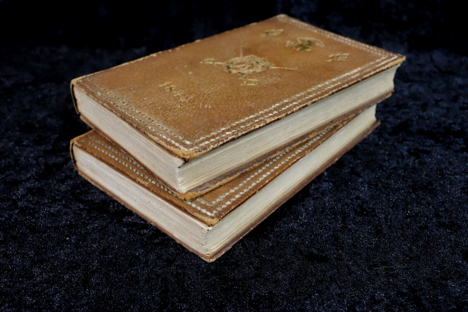 Elaborate 1899 rebind with a beige leather armorial cover for Henry Arthur Johnstone. The inside hinge at the title page of Volume 1 is begnning to split however there are no loose pages in either volume. Pages are very clean and well presented. Please study photos to understand condition. Happy to provide more photos on request.