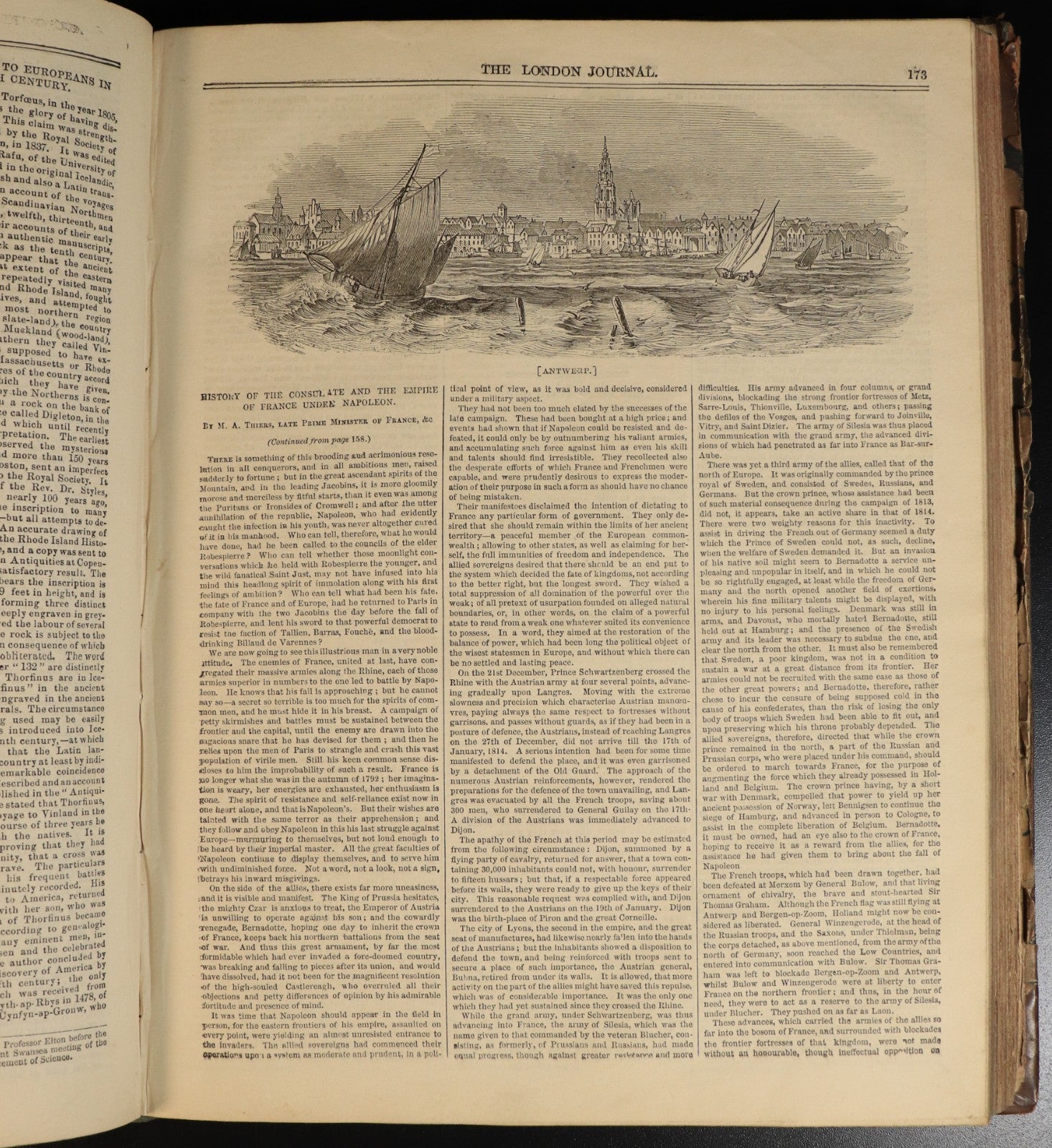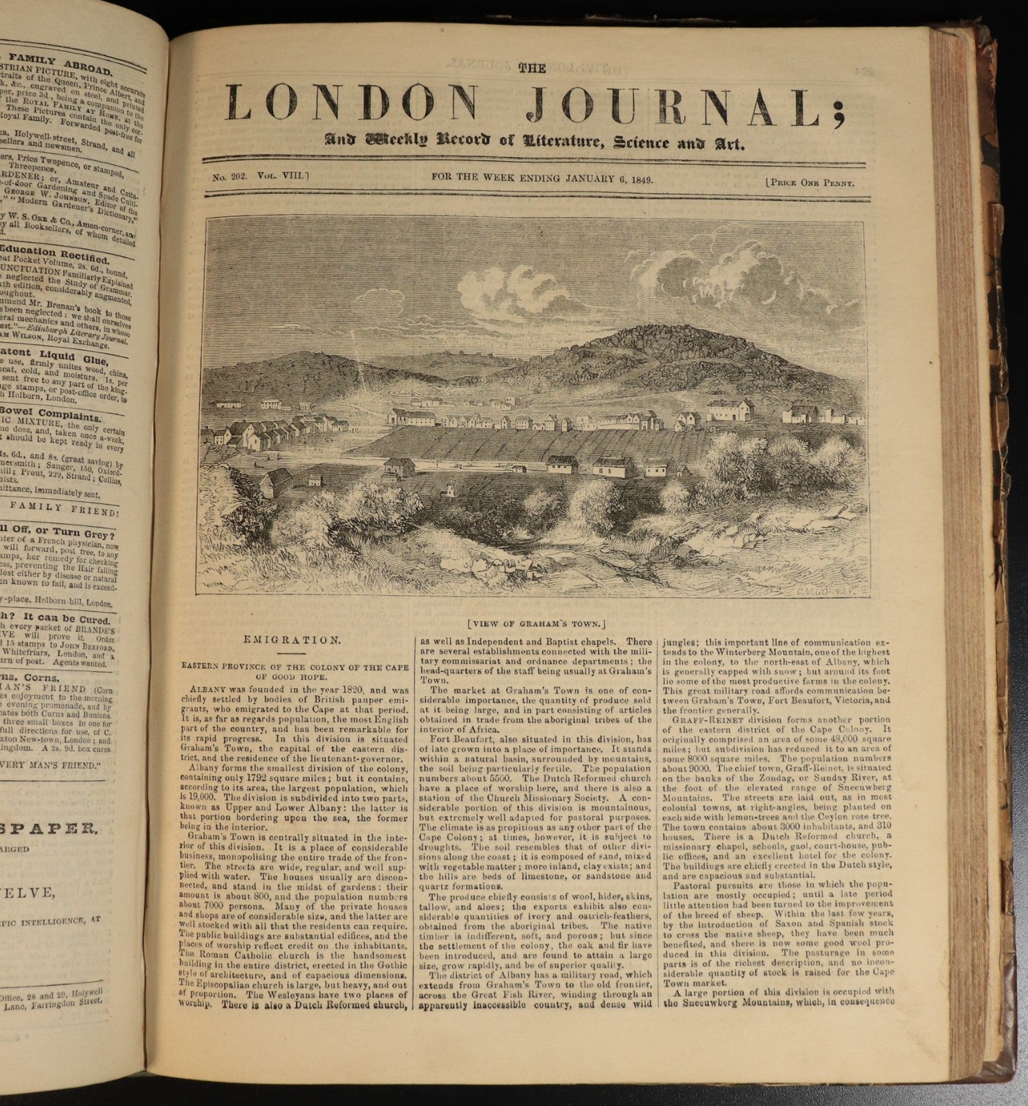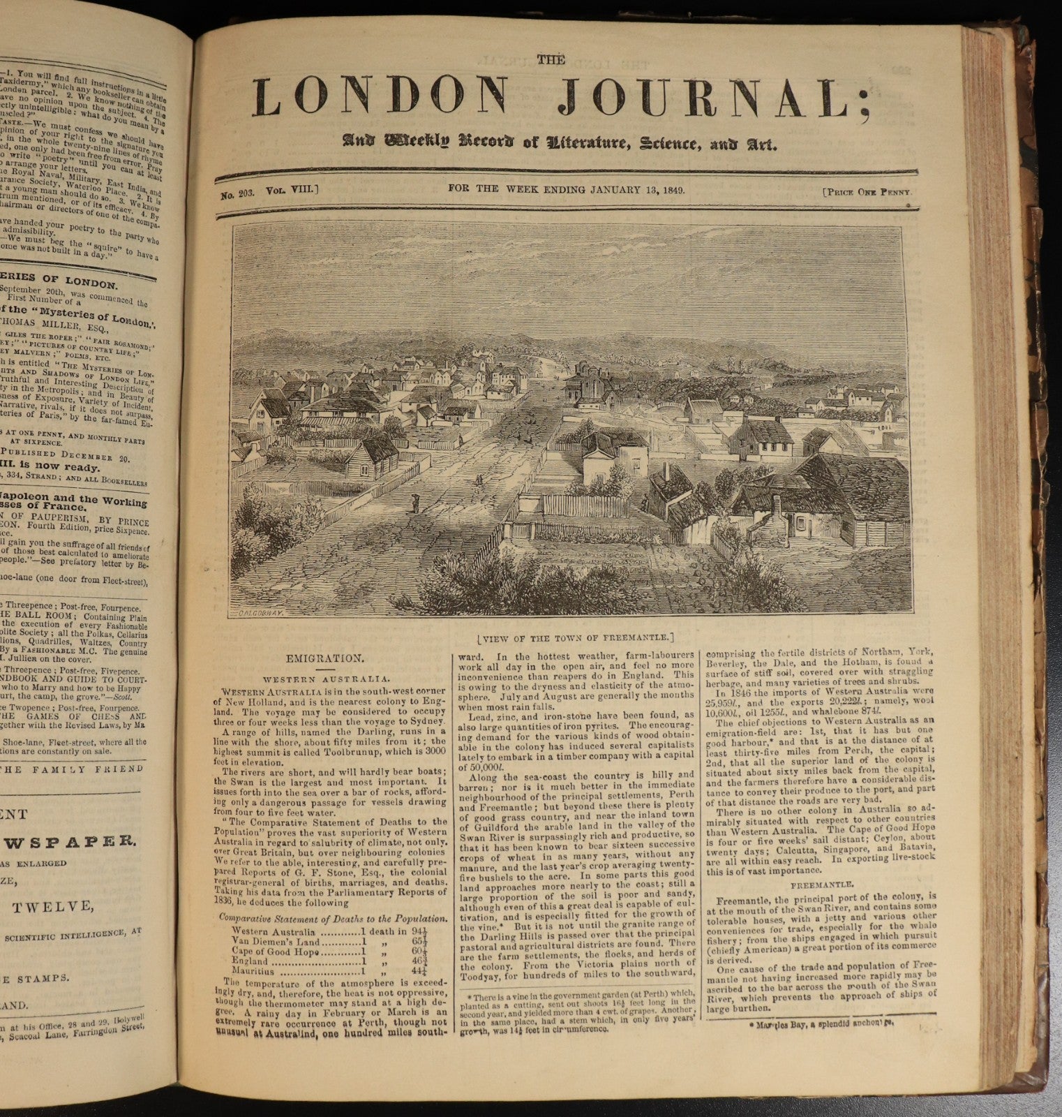 A particularly notable feature of this volume is the substantial illustrated article on Fremantle, Western Australia, accompanied by a striking engraving depicting the port and settlement as it appeared in the late 1840s. The article describes the town's development from a fledgling penal and trading outpost into a modest yet promising colonial port, highlighting its harbour, stone buildings, and the surrounding landscape of the Swan River Colony. It comments on the colony's growing agricultural and maritime prospects while noting the challenges of isolation and harsh conditions. For contemporary readers, this piece offered one of the earliest pictorial and descriptive glimpses of Western Australia to appear in a widely circulated British journal—reflecting Britain's evolving perception of its distant colonies not merely as penal sites, but as emerging societies of enterprise and endurance."