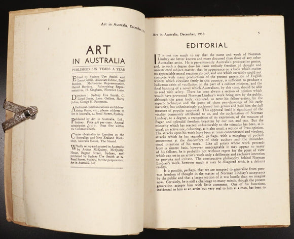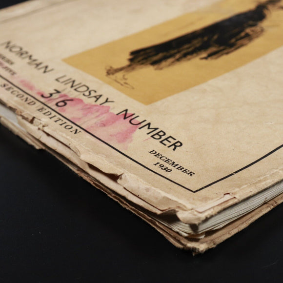 Seller Notes: Book has some water damage affecting cover and prelims with artwork/plates in fair condition. Cover with staining and chipping as shown. Includes all 39 plates - first 10 plates clean, remaining plates with some yellowing and minor wrinkling on the bottom edges. Advertising at back of magazine is stuck together and would require some TLC and steamwork I would imagine to separate. Great copy if the original artwork is your desire or you'd like to have a spare reading copy of this desirable Norman Lindsay publication. Please study photos to further understand condition.
