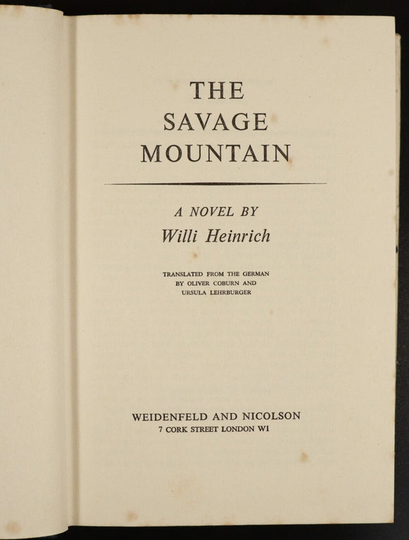 1958 The Savage Mountain by Willi Heinrich Vintage Military Fiction BookThe Savage MountainBy Willi HeinrichPublished by Weidenfeld & Nicolson: London 1958 1st UK Edition"Willi Heinrich (1920-2005) was a German author and soldier. During the Second World War he fought in the 101st Jäger Division, which suffered massive losses on the Eastern Front, and his combat experiences inspired his first successful novel, Das geduldige Fleisch (1955), published in English translation as The Willing Flesh (1956) in the United Kingdom and as Cross of Iron (1957) in the United States. He later wrote a series of popular genre novels and potboilers in the 1970s and 1980s."General wear, chipping & minor tape repaired tears to dustjacket. No inscriptions or library marks. Age spotting to text block edge and very light age spotting to a few pages. Good condition overall. Please study photos to understand condition. Happy to provide more photos on request. Note - 4 copies available at time of listing - 2 have small inscriptions, 1 has a section of the front blank endpaper removed where an inscription was. All 4 copies have good clean pages and dustjackets in varying conditions. Please get in touch prior to purchase if there is a particular aspect of importance to you.Size 20.5cm x 14cm x 4cm - 320 Pages
