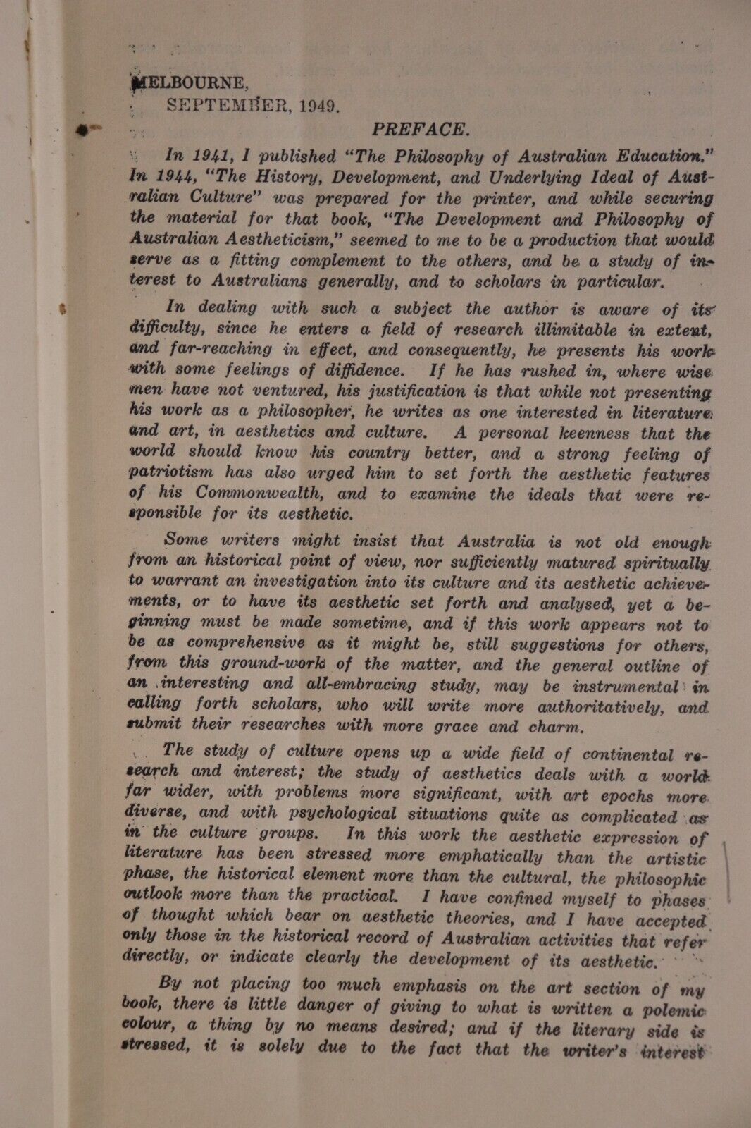1949 Australian Aestheticism by DH Rankin Scarce 1st Edition Australian Art BookThe Development and Philosophy of Australian AestheticismBy D.H. RankinPublished by D.H. Rankin: Melbourne 1949Fading to cover and first half of book pages have a crease as shown. Please study photos to understand condition. Happy to provide more photos on request.Size 22cm x 14cm x 2.5cm