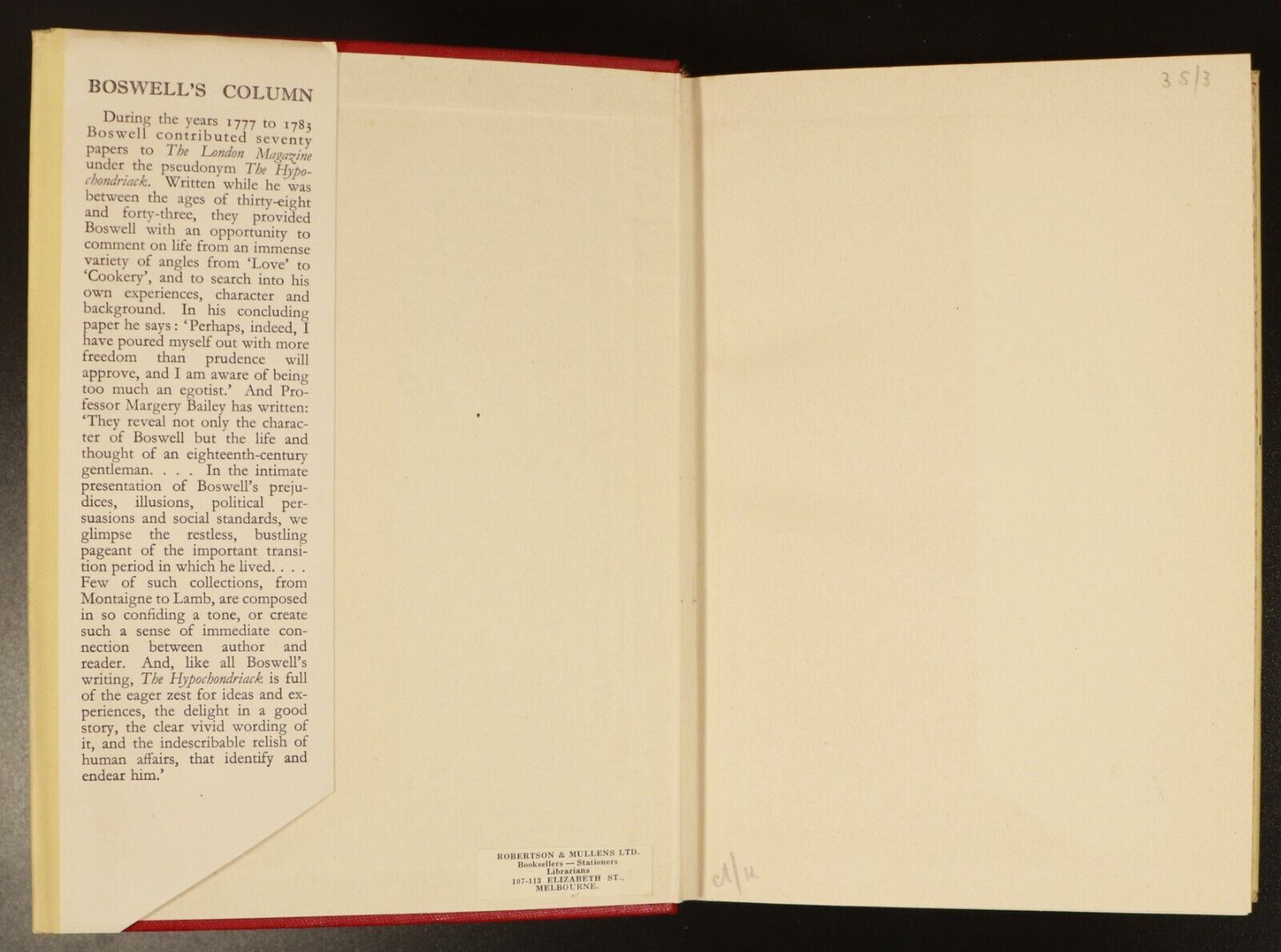 Boswell's Column - Being his seventy contributions to The London Magazine under the pseudonym The Hypochondriack from 1777 to 1783 here first printed in book form in England.