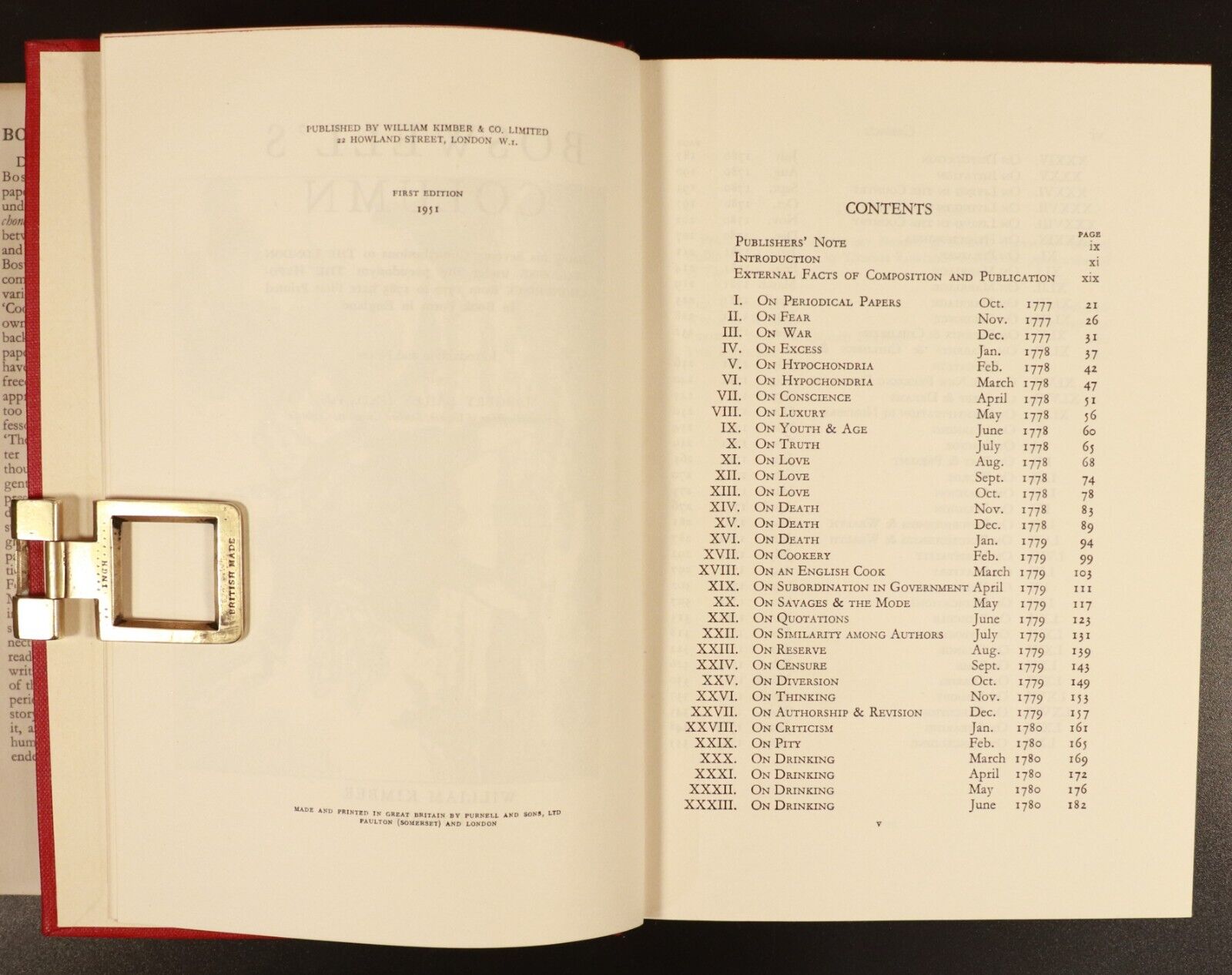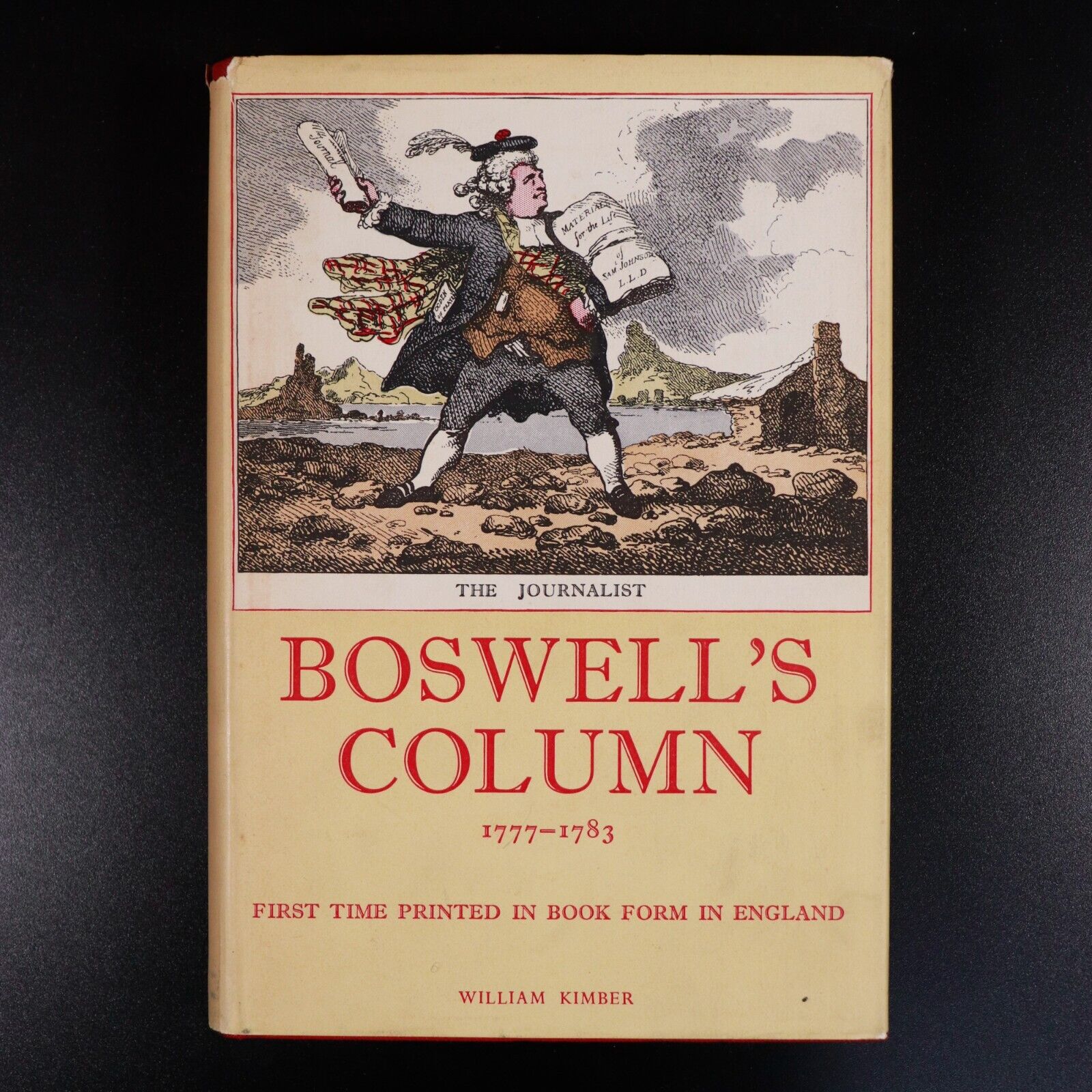 1951 Boswell's Column 1st Edition Vintage Scottish History BookBoswell's Column - Being his seventy contributions to The London Magazine under the pseudonym The Hypochondriack from 1777 to 1783 here first printed in book form in England.Introduction by Margery BaileyPublished by William Kimber: London 1951 1st Edition"James Boswell, 9th Laird of Auchinleck (29 October 1740 - 19 May 1795), was a Scottish biographer, diarist, and lawyer, born in Edinburgh. He is best known for his biography of his friend and older contemporary, the English writer Samuel Johnson, which is commonly said to be the greatest biography written in the English language. A great mass of Boswell's diaries, letters, and private papers were recovered from the 1920s to the 1950s, and their ongoing publication by Yale University has transformed his reputation."Light wear and minor tears/chipping to dustjacket. No inscriptions. Pages clean and bright and the book is in very good condition overall. Please study photos to understand condition. Happy to provide more photos on request.Size 24cm x 17cm x 3.5cm - 359 Pages
